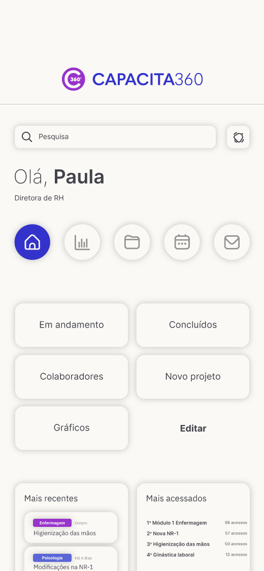 Atuamos com diagnóstico da saúde emocional, identificação de fatores de risco psicossociais e implementação de programas de apoio emocional contínuos. A plataforma oferece acompanhamento psicológico, trilhas de bem-estar mental, conteúdos educativos e suporte humano especializado — tudo alinhado com as exigências da NR1.